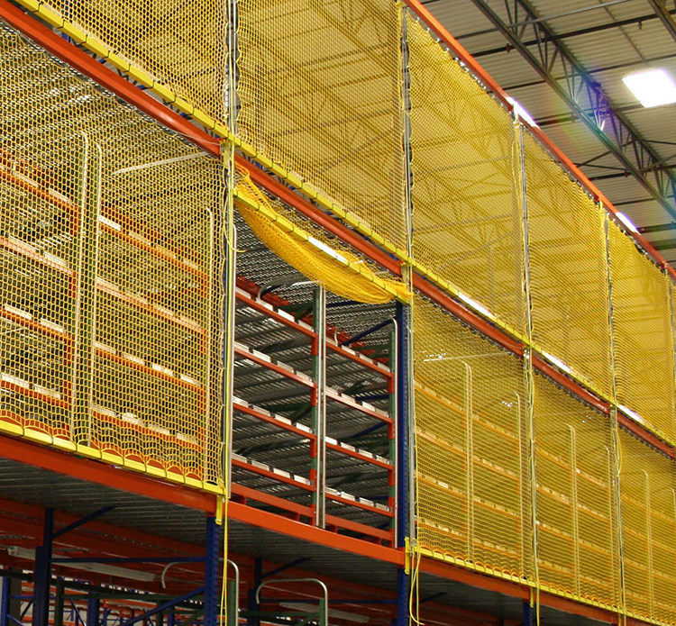 The fix is to use netting designed specifically for mezzanine applications. These systems can fill railing gaps and extend above the top rail to contain over-height inventory, ensuring full perimeter protection.
